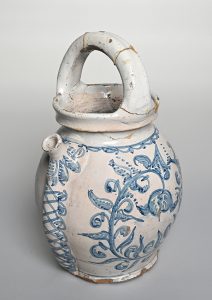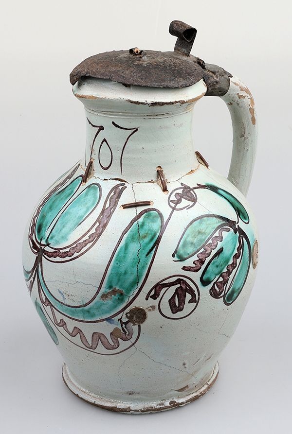 Dünnglasierte Fayence, die sich mit vier Exemplaren in der Sammlung befindet, ist eine typische Keramikvariante der Deutschschweiz der zweiten Hälfte des 17. und des frühen 18. Jahrhunderts. Der genaue Produktionsort ist bislang unbekannt, dürfte jedoch entweder im Kanton Solothurn oder im Jura (ehemals Fürstbistum Basel) liegen, da die Fundverbreitung auch bis in die Region Lörrach streut. Das späteste Stück (um 1725-1740) dürfte die nur noch blau bemalte Bügelkanne mit aussenliegender Ausgussröhre sein. Das älteste Stück von 1686 war einmal eine Stegkanne.
