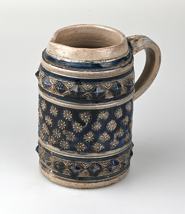 Kugelbauchkrug und Steinzeughumpen, Steinzeug „Westerwälder Art“ aus Rheinland-Pfalz/Westerwald, um 1650-1680 bzw. um 1690-1720 (SST-02343, SST-03180).