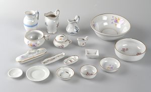 Porzellanobjekte sind in der Sammlung mit 102 Datensätzen vertreten. Die Zusammensetzung – Apothekenporzellan, Puppengeschirr, Hotelporzellan, lokal in Haushaltswarengeschäften Aufglasur-dekoriertes Geschirr – zeigt keine wirklichen Besonderheiten.