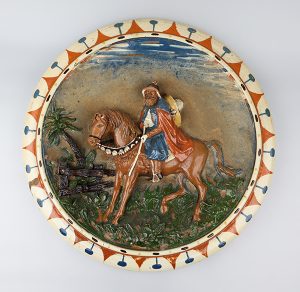 Möglicherweise handelt es sich bei den beiden Platten (SST-12981, SST-12982), um Darstellungen von Hadschi Halef Omar Ben Hadschi Abul Abbas Ibn Hadschi Dawuhd al Gossarah und Kara Ben Nemsi. Beides sind Gestalten die sich im Orientzyklus, einer Serie von Romanen des Schriftstellers Karl May (1842-1912) finden. Die zugrundeliegenden Erzählungen erschienen, teils mit Unterbrechungen, zwischen 1881 und 1888 in der Zeitschrift «Deutscher Hausschatz in Wort und Bild» bei Friedrich Pustet in Regensburg. Die Erzählungen wurden ab 1892 in den Gesammelten Werken Karl Mays nachgedruckt. Sollte die Interpretation der Darstellung korrekt sein, so dürfte es sich um Keramik von Gottfried Tschanz, jun. (1859-1930) handeln. Aus Familienbesitz Tschanz.