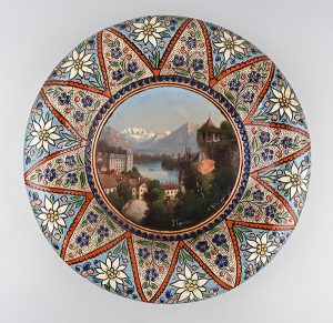 Aus der Manufacture de poteries S. A., für Pflüger Frères et Cie (Lausanne), verwahrt die Sammlung einen ganz besonders spannenden Teller, der belegt, dass sich nach der Weltausstellung in Paris auch andere Hersteller bewusst waren, dass die Thuner Majolika ein Geschäft zu werden versprach.