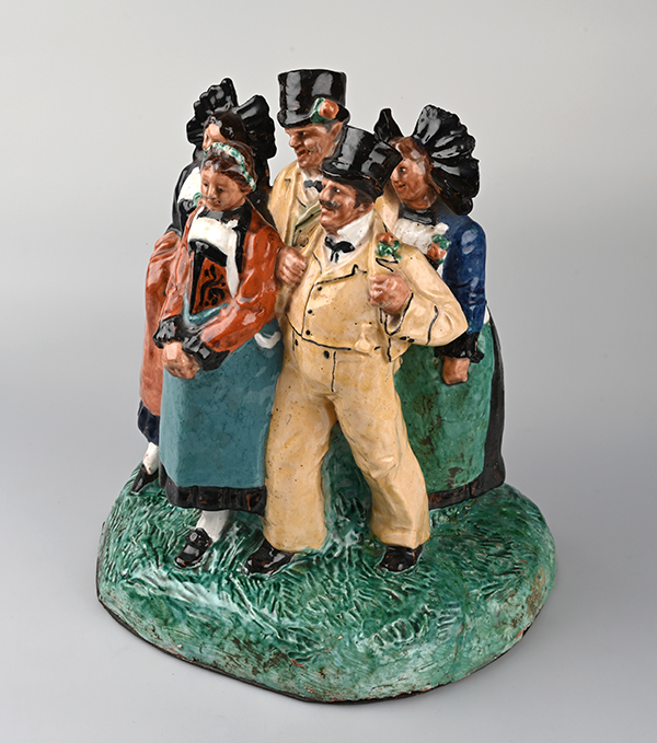 Zu den herausragenden und singulären Einzelstücken der Sammlung gehört die Figurengruppe Wilhelm Tell und Walterli. Rudolf Amstutz war seit 1932 der Besitzer der Töpferei Heimberg, Bernstrasse 310. Diese hatte er von Ernst Loder (1882-1958) erworben. Seit mindestens 1849 befanden sich auf der Liegenschaft zwei Hafnerwerkstätten, von denen zumeist eine regelhaft an namentlich nicht bekannte Hafner vermietet war. Laut Aussagen des Verkäufers wurde die Figur «1864 von dem aus dem Aargau zugewanderten Hafner K. Bercher» gefertigt. Sie stand angeblich als «Handwerkszeichen» zusammen mit dem Tellenknaben Walterli «in der Ründe der alten Töpferei». Während die Lokalisierung korrekt sein kann, gilt dies nicht für die Datierung und die Zuschreibung an den angeblich zugewanderten Töpfergesellen Karl Bercher. Karl Bercher wurde in Heimberg geboren und lebte von 1879 bis 1943. Er war der Sohn des Hafners Gottlieb Bercher (1837-1904) aus Reckingen AG, der 1859-1866 zunächst als Geselle bei Johann Fahrni und Niklaus Frei in Heimberg arbeitete und sich dann dort fest niederlies. Von 1880-1897 besass er die von ihm neu erbaute Töpferei Heimberg, Dornhaldestr. 33. Karl Bercher arbeitete ebenfalls als Hafner, wir wissen jedoch nicht, in welcher Töpferei. Stammt die Figur wirklich von Karl Bercher, so müsste sie wohl um 1900 datieren, stammt sie hingegen von seinem Vater Gottlieb, dann wäre eine Datierung in die Zeit 1860-1880 wahrscheinlicher. Das Problem von Datierung und Produzent kann nachträglich nicht gelöst werden.
