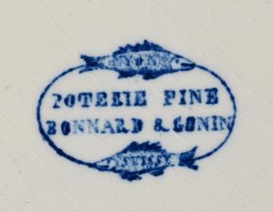 Thuner Majolika, Frühphase um 1878-1883 , Weltausstellungsgeschirr Paris, oft mit der Marke des Kommissionärs Johann Heinrich Schoch-Läderach, der die drei ausstellenden Hafner in Paris vertrat. Es ist nicht klar, wann diese Stücke genau gefertigt wurden und wie lange Schoch-Läderach diese Marke anbringen liess (Marken: SST-05185, SST-14631, SST-14178).