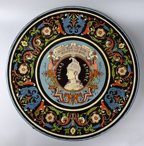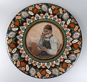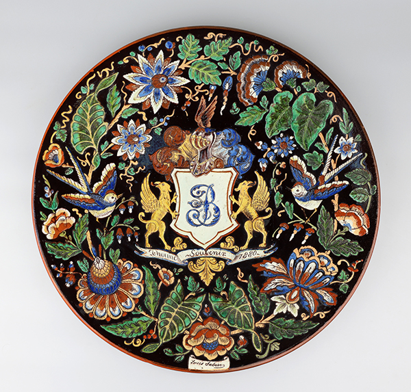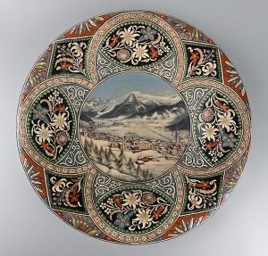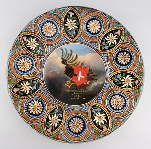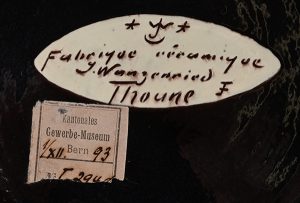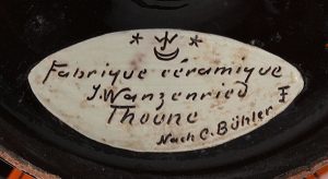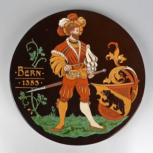Aus der Manufacture de poteries S. A., für Pflüger Frères et Cie (Lausanne), verwahrt die Sammlung einen ganz besonders spannenden Teller, der belegt, dass sich nach der Weltausstellung in Paris auch andere Hersteller bewusst waren, dass die Thuner Majolika ein Geschäft zu werden versprach.