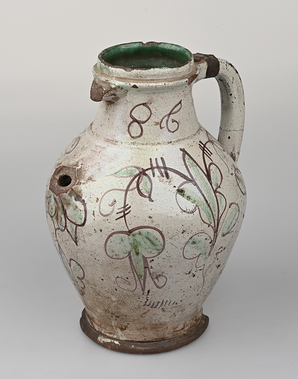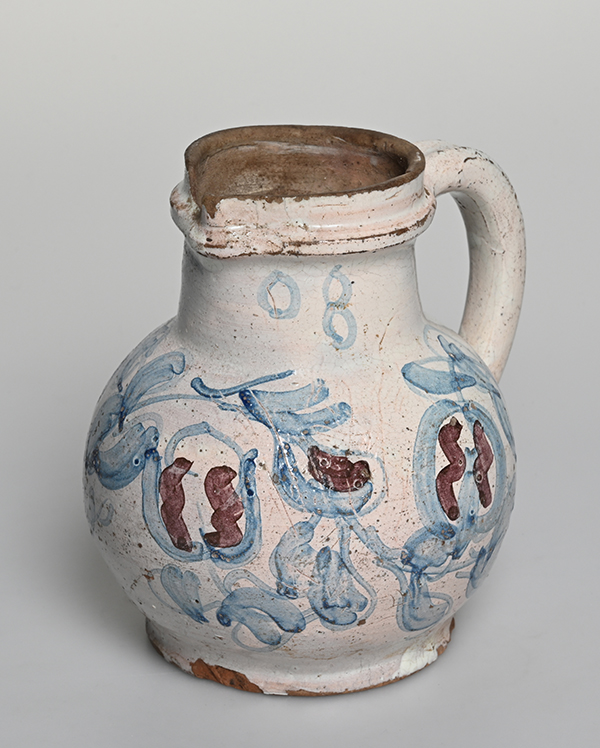 Dünnglasierte Fayence, die sich mit vier Exemplaren in der Sammlung befindet, ist eine typische Keramikvariante der Deutschschweiz der zweiten Hälfte des 17. und des frühen 18. Jahrhunderts. Der genaue Produktionsort ist bislang unbekannt, dürfte jedoch entweder im Kanton Solothurn oder im Jura (ehemals Fürstbistum Basel) liegen, da die Fundverbreitung auch bis in die Region Lörrach streut. Das späteste Stück (um 1725-1740) dürfte die nur noch blau bemalte Bügelkanne mit aussenliegender Ausgussröhre sein. Das älteste Stück von 1686 war einmal eine Stegkanne.