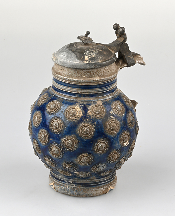 Kugelbauchkrug und Steinzeughumpen, Steinzeug „Westerwälder Art“ aus Rheinland-Pfalz/Westerwald, um 1650-1680 bzw. um 1690-1720 (SST-02343, SST-03180).