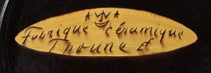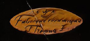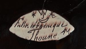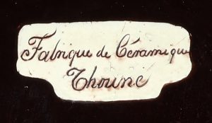 Thuner Majolika, Frühphase um 1878-1883 , Weltausstellungsgeschirr Paris, oft mit der Marke des Kommissionärs Johann Heinrich Schoch-Läderach, der die drei ausstellenden Hafner in Paris vertrat. Es ist nicht klar, wann diese Stücke genau gefertigt wurden und wie lange Schoch-Läderach diese Marke anbringen liess (Marken: SST-05185, SST-14631, SST-14178).
