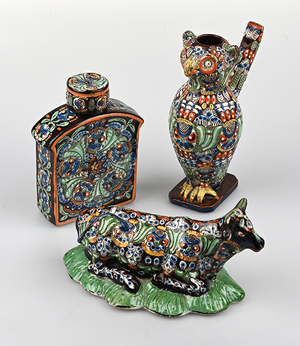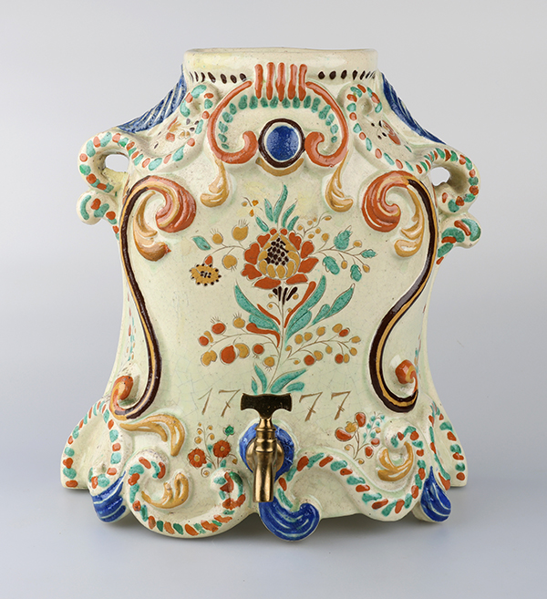 Darunter befinden sich Fayencen ganz unterschiedlicher Herkunft, z.B. aus Winterthur, Zollikon, Hanau, Nürnberg, Ansbach, Niderviller, Ostfrankreich, Strassburg, Matzendorf und Kilchberg-Schooren sowie eine Fälschung aus der Manufaktur Fleischmann aus Nürnberg.
