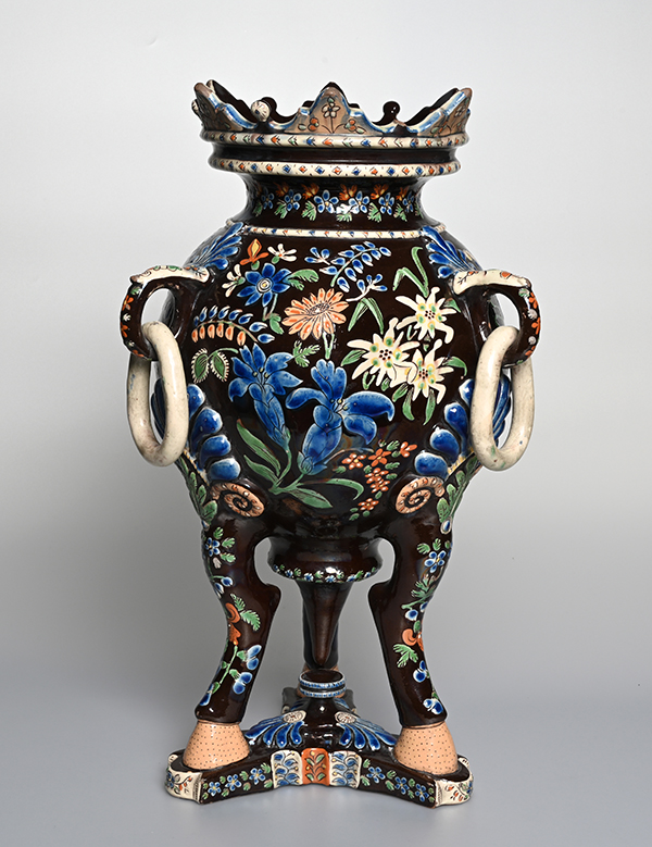 Vase mit Ziegenfüssen, signiert „GT“ (Gottfried Tschanz, SST-12275). Die Edelweiss verweisen auf eine Produktion nach 1883.