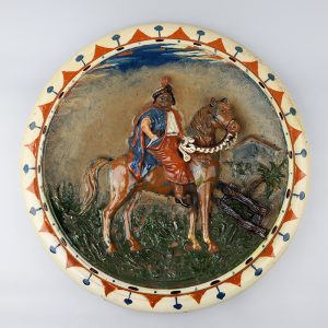 Möglicherweise handelt es sich bei den beiden Platten (SST-12981, SST-12982), um Darstellungen von Hadschi Halef Omar Ben Hadschi Abul Abbas Ibn Hadschi Dawuhd al Gossarah und Kara Ben Nemsi. Beides sind Gestalten die sich im Orientzyklus, einer Serie von Romanen des Schriftstellers Karl May (1842-1912) finden. Die zugrundeliegenden Erzählungen erschienen, teils mit Unterbrechungen, zwischen 1881 und 1888 in der Zeitschrift «Deutscher Hausschatz in Wort und Bild» bei Friedrich Pustet in Regensburg. Die Erzählungen wurden ab 1892 in den Gesammelten Werken Karl Mays nachgedruckt. Sollte die Interpretation der Darstellung korrekt sein, so dürfte es sich um Keramik von Gottfried Tschanz, jun. (1859-1930) handeln. Aus Familienbesitz Tschanz.