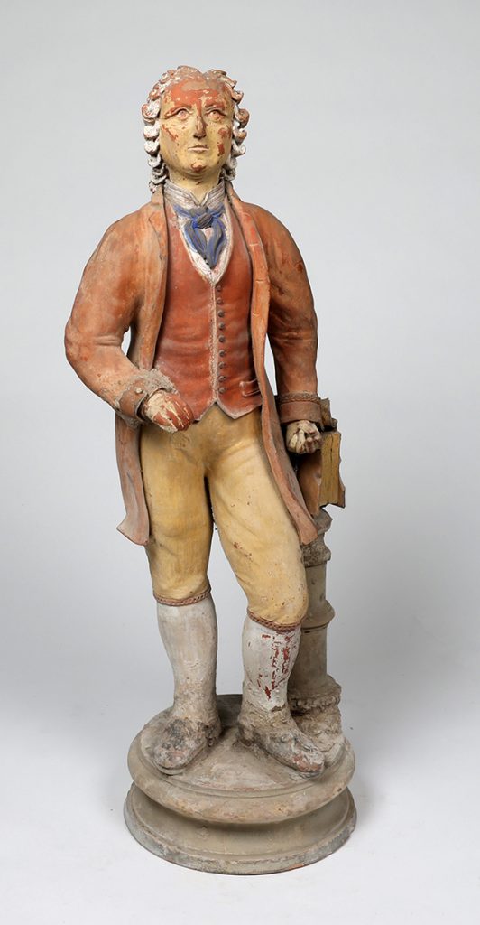 Zu den herausragenden und singulären Einzelstücken der Sammlung gehört die Figurengruppe Wilhelm Tell und Walterli. Rudolf Amstutz war seit 1932 der Besitzer der Töpferei Heimberg, Bernstrasse 310. Diese hatte er von Ernst Loder (1882-1958) erworben. Seit mindestens 1849 befanden sich auf der Liegenschaft zwei Hafnerwerkstätten, von denen zumeist eine regelhaft an namentlich nicht bekannte Hafner vermietet war. Laut Aussagen des Verkäufers wurde die Figur «1864 von dem aus dem Aargau zugewanderten Hafner K. Bercher» gefertigt. Sie stand angeblich als «Handwerkszeichen» zusammen mit dem Tellenknaben Walterli «in der Ründe der alten Töpferei». Während die Lokalisierung korrekt sein kann, gilt dies nicht für die Datierung und die Zuschreibung an den angeblich zugewanderten Töpfergesellen Karl Bercher. Karl Bercher wurde in Heimberg geboren und lebte von 1879 bis 1943. Er war der Sohn des Hafners Gottlieb Bercher (1837-1904) aus Reckingen AG, der 1859-1866 zunächst als Geselle bei Johann Fahrni und Niklaus Frei in Heimberg arbeitete und sich dann dort fest niederlies. Von 1880-1897 besass er die von ihm neu erbaute Töpferei Heimberg, Dornhaldestr. 33. Karl Bercher arbeitete ebenfalls als Hafner, wir wissen jedoch nicht, in welcher Töpferei. Stammt die Figur wirklich von Karl Bercher, so müsste sie wohl um 1900 datieren, stammt sie hingegen von seinem Vater Gottlieb, dann wäre eine Datierung in die Zeit 1860-1880 wahrscheinlicher. Das Problem von Datierung und Produzent kann nachträglich nicht gelöst werden.
