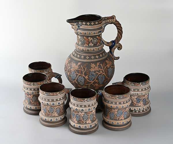 Bierkanne und Humpen-Set, ohne Aussenglasur, wie es ab ca. 1885 kurzfristig Mode war, signiert „GT“ und „Thun“ im Oval (SST-13280).