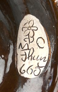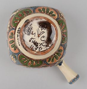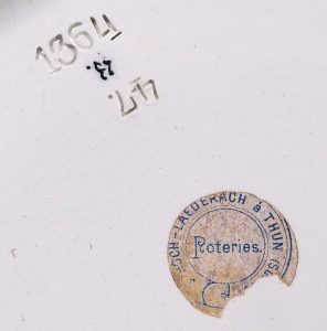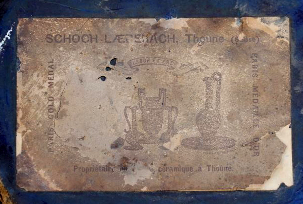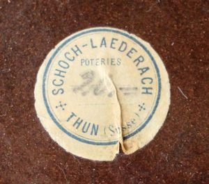 Schoch-Läderach war ein Keramikhändler. Es erstaunt daher nicht, dass er auch andere Keramik als die in Heimberg hergestellte Thuner Majolika verkaufte und diese mit seinem Aufkleber versah.