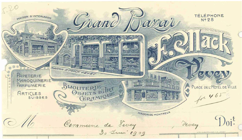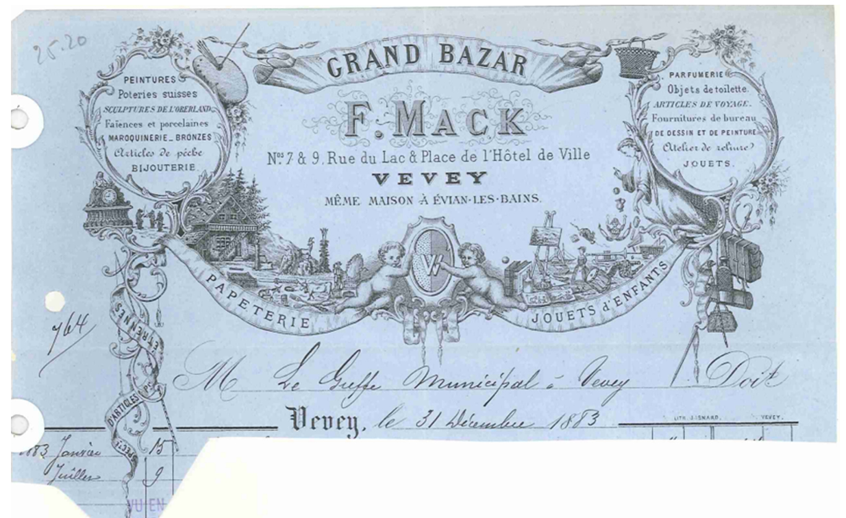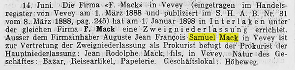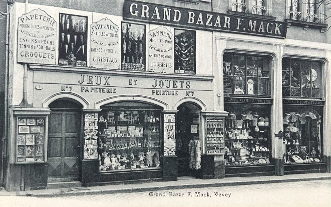 Samuel Mack (1840-1912) war ein Enkel des Deutschen Gottlieb Mack (1783-1848) aus Sontheim an der Brenz in Württemberg. Dieser hatte sich am 26. März 1819 in Vevey, Kanton Waadt, einbürgern lassen. Sein Sohn Amédée François Louis Mack („François“, 1811-1857) hatte mit Rose Faucherre (?-1889) neun Kinder, darunter sieben Söhne. Der Zweitgeborene war (Auguste Jean François) Samuel. François gründete 1834 ein Schreibwarengeschäft/Papeterie nebst Buchhandlung. Samuel bildete sich zur Erlernung der deutschen Sprache nach seiner Schulzeit in Heilbronn, heute Baden-Württemberg, fort. Nach dem Tod des Vaters übernahm Samuel am 1. Mai 1863 (Feuille d’avis d’Aigle, 10. Mai 1863) das Geschäft zusammen mit seiner Mutter und später mit seinem Bruder Edouard (1846-1919). Zu diesem Zeitpunkt befand sich das Geschäft in der Rue du Lac, 17 in Vevey. Wenig später heiratete Samuel Mack Fanny Thury (?-1877) von Morges VD. Am 2. Dezember wurde Jean Rodolphe Mack (1864-?), das erste Kind von Samuel Mack geboren. Das Geschäft wurde 1864 an die Adresse Rue du Lac, 7 und 9 verlagert und vergrössert, das Sortiment um Kinderspielzeug und vieles mehr erweitert und im Mai 1865 als Magasin neu eröffnet. Ab 1868 wurden auch Früchte verkauft und ab 1870 Schönheits- und Körperpflegeprodukte.