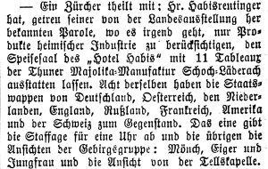 Ausstellungszeitung zur Schweizerischen Landesausstellung 1883, No. 1&2, Seite 6, vom November 1882.
