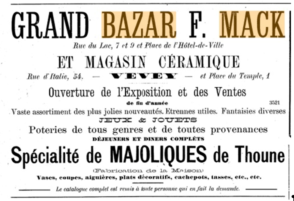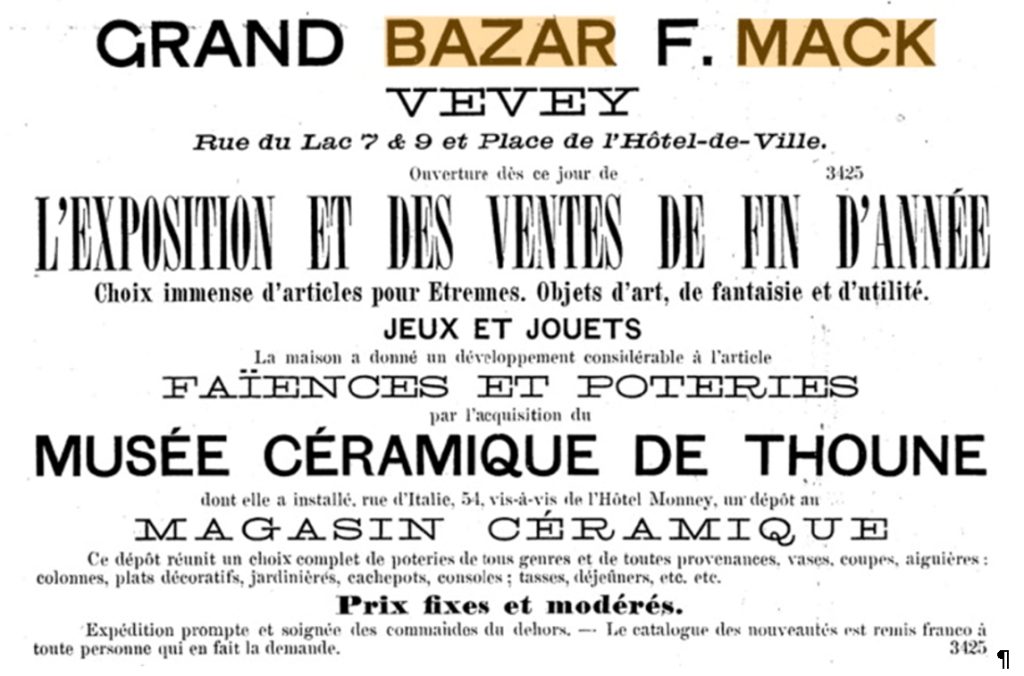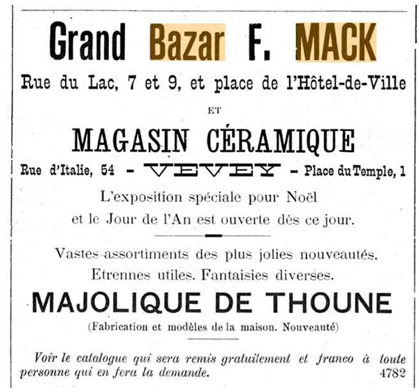 In Vevey wurde der Kauf des „Musée céramique de Thoune“ durch Samuel Mack schon am 12. Dezember 1889 in einer Werbeanzeige in der Zeitung mitgeteilt. Gleichzeitig eröffnete er in der Rue d’Italie 54 ein „Magasin céramique“, das bis 1895 bestand.