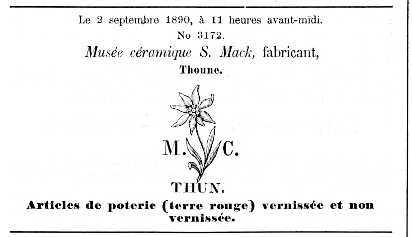 Samuel Mack ging in der Folge sehr zielgerichtet vor. Im September 1890 liess er eine Firmenmarke des „Musée céramique“, selbstverständlich mit Edelweiss, entwerfen und im Handelsregister eintragen, was unter Schoch-Läderach vorher offenbar nicht geschehen war. Wir können also begründet vermuten, dass alle Keramiken mit dieser Marke erst unter Samuel Mack oder seinen Nachfolgern (bis 1907) entstanden sind, da diese keine Markenänderung vornahmen.