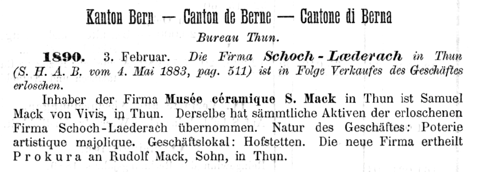 Samuel Mack (Heimatort Vevey, 1840-1912) über nahm das Musée céramique 1890 von Johann Heinrich Schoch-Läderach (SHAB 8, 1890, No. 18, 3. Februar 1890). Prokura vor Ort erhielt dessen Sohn Rodolphe Mack. Das Geschäftslokal befand sich in Hofstetten und als Geschäftszweck wurde angegeben «Poterie artistique majolique». Im Mai 1891 erhielt auch Georges-Louis Arlaud von Genf, Samuels Schwiegersohn, Procura (SHAB 9, 1891, No. 12, 8. Mai 1891).