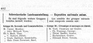 Dort stellte er im Keramik-Pavillon neben verschiedenen anderen Keramikproduzenten eine Kollektion Thuner und Heimberger Majolika aus: Samuel Born-Straub (Heimberger Majolika, Aussteller Nr. 1376), der Kollektivausstellung der Heimberger Hafner (Gewöhnliches Gebrauchsgeschirr, Aussteller Nr. 1383), der Fabrik von Johannes Wanzenried (Majolika, Vasen, Platten, Services, Intarsien für Möbel, Vertäfelungen, Zimmerdekoration, Kunst- und Gebrauchskeramik, Aussteller Nr. 1391), Richard Grüninger, Hafner, Berneck (Kollektion Töpferwaren, Austeller Nr. 1397), H. Hanhart, Winterthur (Decorierte Fayencen, Aussteller Nr. 1399), A. Krebser & Co., Heimberg (Platten, Vasen, Krüge, überhaupt Decorationsgegenstände in schöner antiker Facon, Aussteller Nr. 1405), Pflüger, frères, Lausanne, Fabrique à Nyon (Poteries artistiques, Aussteller Nr. 1417-1), Jules Michaud, Manufacture des poterie à Nyon (Poteries blanche, Aussteller Nr. 1417-2), Picolas & Degrange, Carouge (Echantillons des faïences fines, Aussteller Nr. 1418), Alexander Schwartz, Genf (Poteries artistiques, Aussteller Nr. 1429) und Ziegler’sche Thonwaarenfabrik Schaffhausen (Feuerfestes Kochgeschirr, Fayence, Steingut, Aussteller 1443).