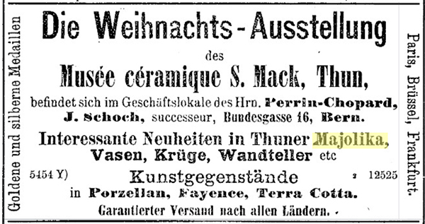 Im selben Jahr gab es eine grosse Weihnachtsausstellung in Bern mit Neuheiten in Thuner Majolika (Der Bund, Band 45, Nummer 344, 12, 12.12.1894) sowie ebenfalls eine grosse Weihnachtsausstellung in Vevey (Werbeanzeige 4.12.1894).
