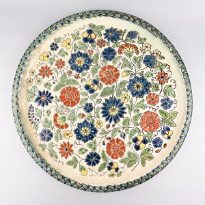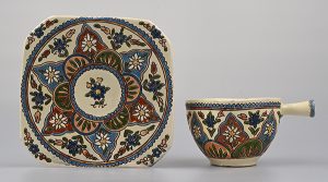 Das Edelweiss tauchte jedoch bereits 1860 in den romantischen Bergsteiger-, Förster- und Liebesgeschichten des deutschen Lyrikers Christian Hoeppl (1826-1862) auf, die auch in der Schweiz nachgedruckt wurden (Zürcherische Freitagszeitung, Nummer 22, 1. Juni 1860). Es avancierte zur Bergsteiger und Romantik-Blume. Weitere deutsche und schweizerische „Volksschriftsteller“ folgten mit ihren Romanen und Lyrikbänden (siehe https://www.e-newspaperarchives.ch, Suche nach „Edelweiss“). Zusammen mit der Alpenrose wurde das Edelweiss Symbol für die schweizerischen Nationalfarben (Der Bund, Band 16, Nummer 99, 10. April 1865), Gedichtbände und Sonntagszeitungen erschienen unter dem Titel „Edelweiss“, Theaterstücke wurden aufgeführt („Almenrausch und Edelweiss“ – Häusliches Charackter-Gemälde aus dem Bayerischen Hochgebirge“), Hotels nach der Blume benannt. Edelweiss sammelte man schliesslich hemmungslos und verkaufte die Blume auch getrocknet zu horrenden Preisen an Touristen. Ab 1871 finden sich dann die ersten Presseaufrufe zum Schutz der einheimischen Flora: „La destrucziun da nossa Flora engiadinaisa.“ (Fögl d’Engiadina, Band 14, Nummer 37, 9. September 1871), denen sich der Schweizerische Alpenklub (SAC) 1878 anschloss, nachdem bereits 1874 der Deutsch-Österreichische Alpenverein zum Schutz des Edelweiss aufgerufen hatte. Zur Popularisierung trugen die breit ausgestreuten Pressenachrichten von „Todesstürzen beim Edelweiss-Suchen“ nicht wenig bei. So verwundert es nicht, dass 1873 erste Werbungen für deutsche Porzellanmalereien von Alpenblumen zu Dekorationszwecken erschienen (Der Bund, Band 24, Nummer 18, 19. Januar 1873). Bereits 1875 verkauft die Fleuristin Witwe Stämpfli in Bern „künstliche Alpenrosen und Edelweiss“ (Intelligenzblatt für die Stadt Bern, 3. Juni 1875). Und in den späten 1870er-Jahren beschlossen verschiedene Kantone und Gemeinden, das Ausreissen des Edelweiss unter Strafe zu stellen. So ist es denn wohl kein Wunder, dass die Blume nicht nur die neue schweizerische Banknotenserie von 1883 zierte sondern auf der Landesausstellung 1883, neben den St. Galler Spitzen und Stickereien bzw. in Form von Brienzer Schnitzereien oder als Silber-Filigranschmuck und Göllerketten, schliesslich auch die Keramik eroberte.