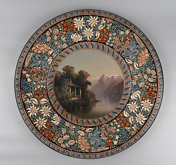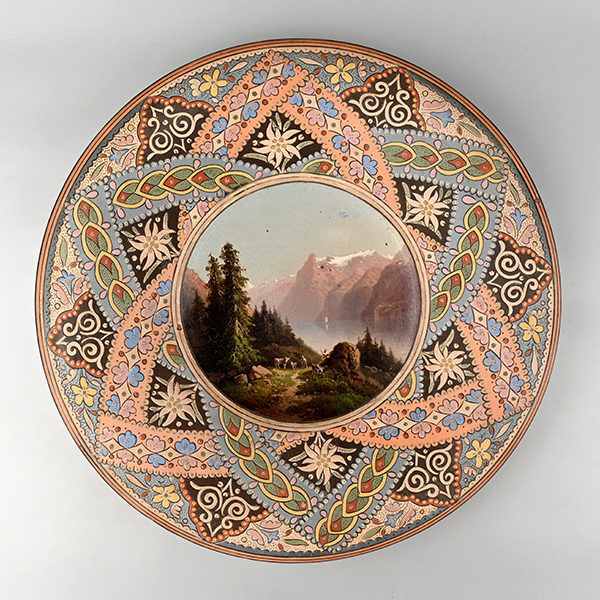 Vedutenteller, zentrale Ölmalerei, Tellskapelle am Vierwaldstättersee. Auf der Fahne das 1883 erstmals gemalte Edelweiss. Entgegen Messerli (1995) gibt es bislang keine Hinweise auf eine frühere Verwendung des Edelweiss auf Keramik.