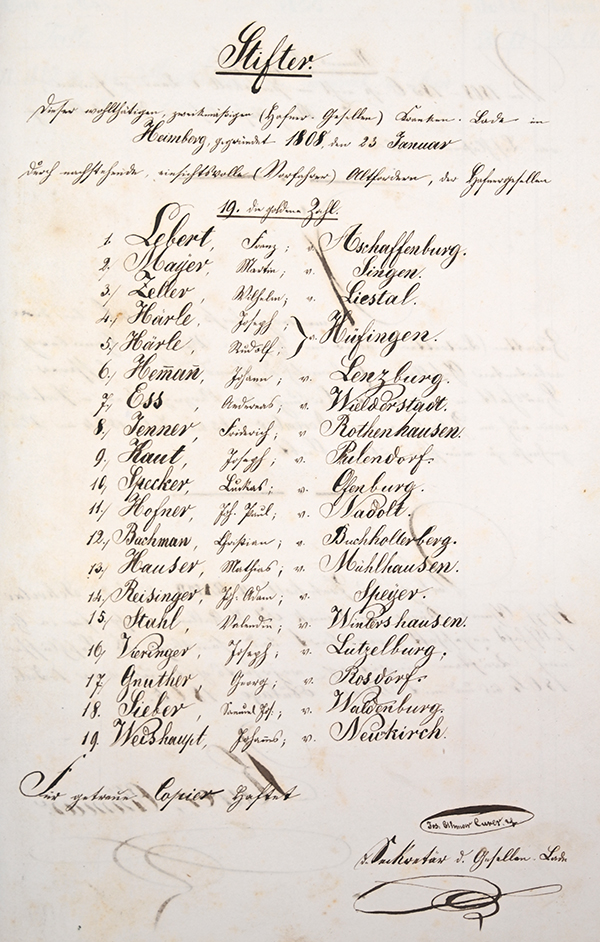 Liste der Gründungsmitglieder 1808 und ihrer Herkunft, Abschrift im Protokollbuch 1864-1869.