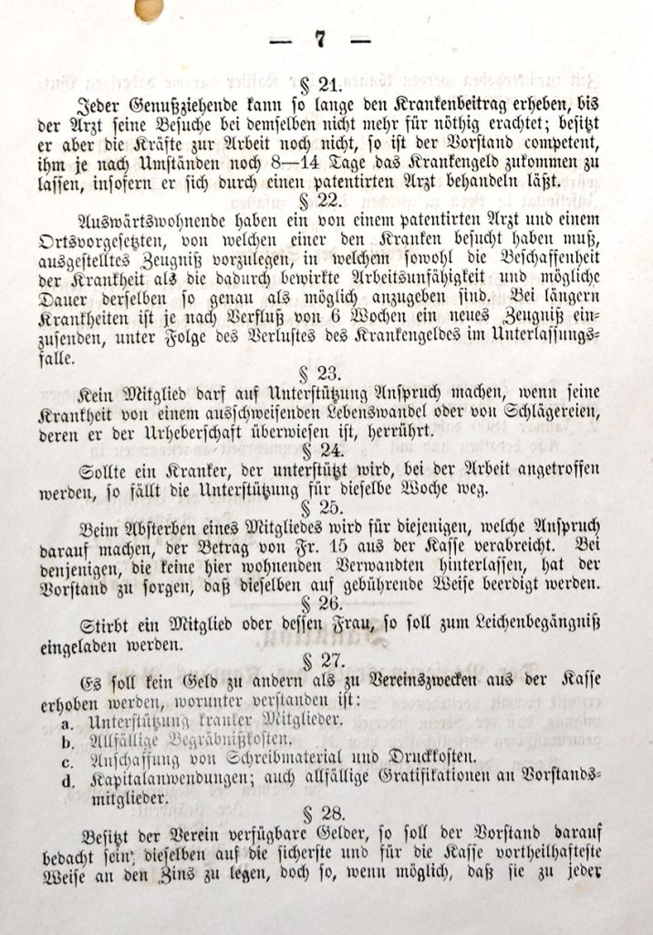 Jeder Vorsteher ist verpflichtet, die Kranken einmal wöchentlich zu besuchen. Sollte ein Vorsteher durch Nachlässigkeit gegen einen Kranken seine Pflicht nicht erfüllen, oder sonst die Bestimmungen dieser Statuten verletzen, so soll er zur Verantwortung gezogen werden und nach Gutachten der Gesellschaft abgesetzt werden.