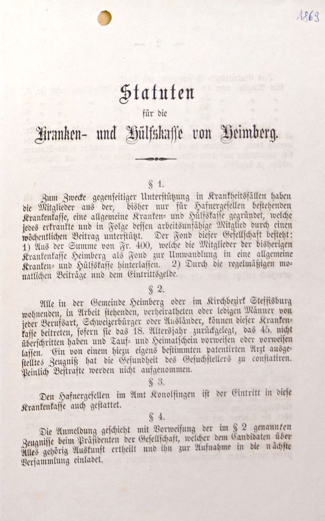 Mit den Statuten vom 2. Oktober 1869 wurde die „Hafner-Gesellen-Krankenkasse“ in eine „Allgemeine Kranken-Hülfskasse“ umgewandelt, in die die Hafnergesellen ein Startkapital von 400 Fr. einbrachten. Aufgenommen wurden. „Alle in der Gemeinde Heimberg oder im Kirchbezirk Steffisburg wohnenden, in Arbeit stehenden, verheiratheten oder ledigen Männer von jeder Berufsart, Schweizerbürger oder Ausländer können dieser Krankenkasse beitreten, sofern sie das 18te Altersjahr zurückgelegt, das 45. nicht überschritten haben u. Tauf- und Heimatschein vorweisen oder vorweisen lassen. Ein von einem hierzu eigens bestimmten patentirten Arzt ausgestelltes Zeugnis hat die Gesundheit des Gesuchstellers zu constatieren. Peinlich Bestrafte werden nicht aufgenommen. Den Hafnergesellen im Amt Konolfingen ist der Eintritt in diese Krankenkasse auch gestattet.“ Die Genehmigung der neuen Statuten erfolgte durch den Kanton Bern unter dem 11.12.1869.