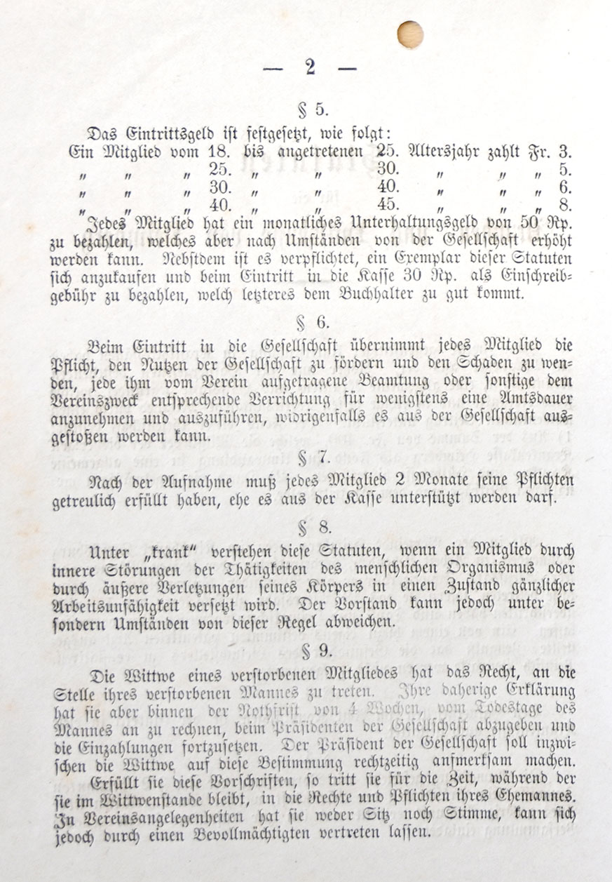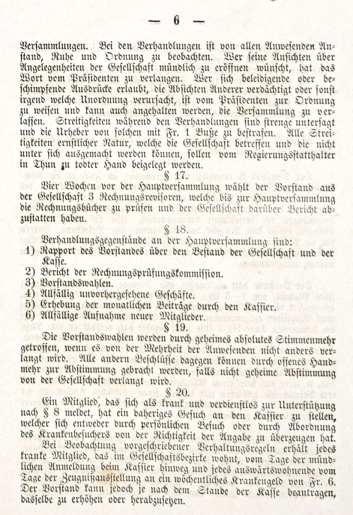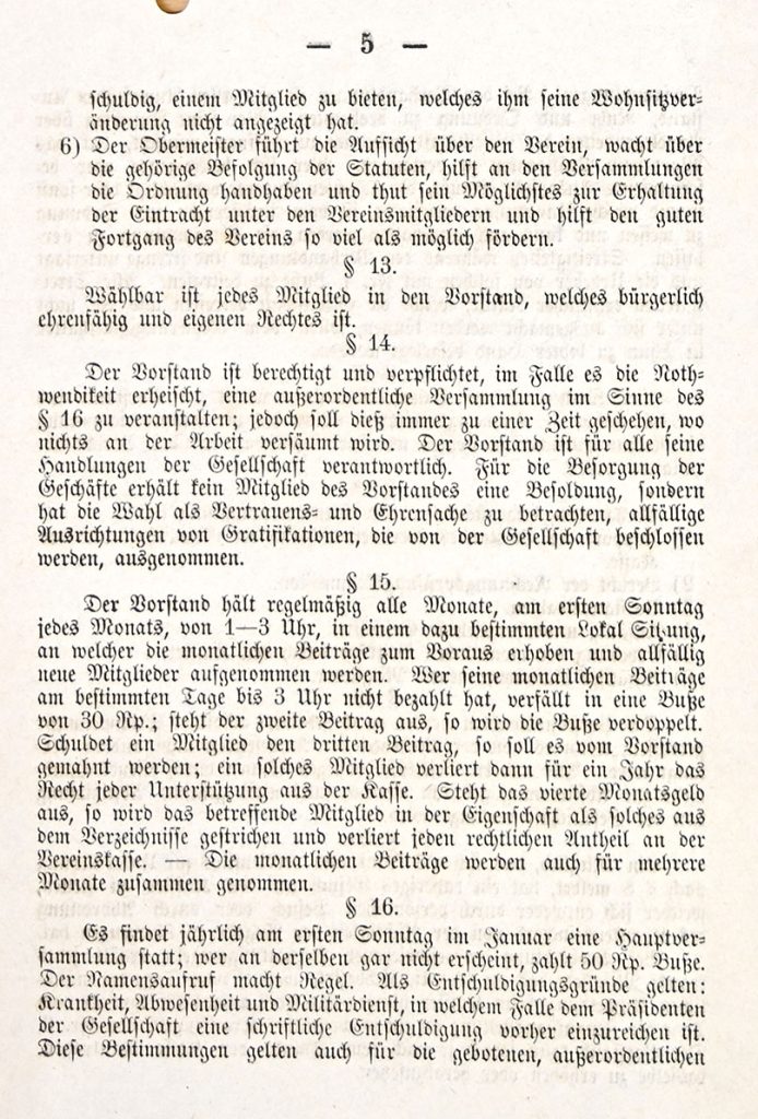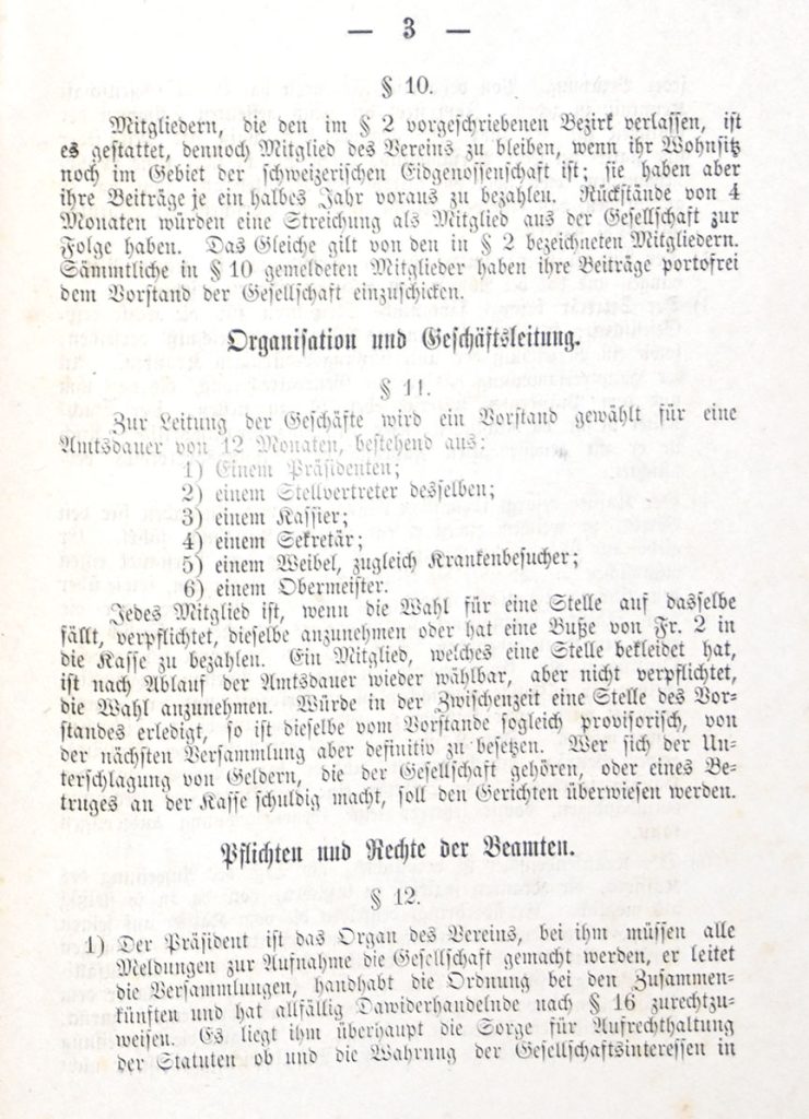 Der Verein hält alle Vierteljahre eine Hauptversammlung zur Passation der Rechnung; überdies versammelt er sich ordentlicherweise jeden ersten Sonntag jeden Monats von 1 bis 2 Uhr in dem dazu bestimmten Lokal. Da findet alsdann die Erhebung der monatlichen Auflagen und die Aufnahme neuer Mitglieder statt; ist die Auflage am Schlusse der Versammlung nicht bezahlt, so verfällt das säumende Mitglied in eine Busse von Cent 30, das zweite mal desgleichen und das dritte mal soll es mit einer Busse von Fr. 1.50 belegt werden. Ebenso verfallen die Mitglieder, welche bei gebotenem oder sonst bekannt gemachten ordentliche und ausserordentlichen Versammlungen fehlen in eine Strafe von Cent 50. Dabei werden aber Krankheiten als Entschuldigung angenommen.