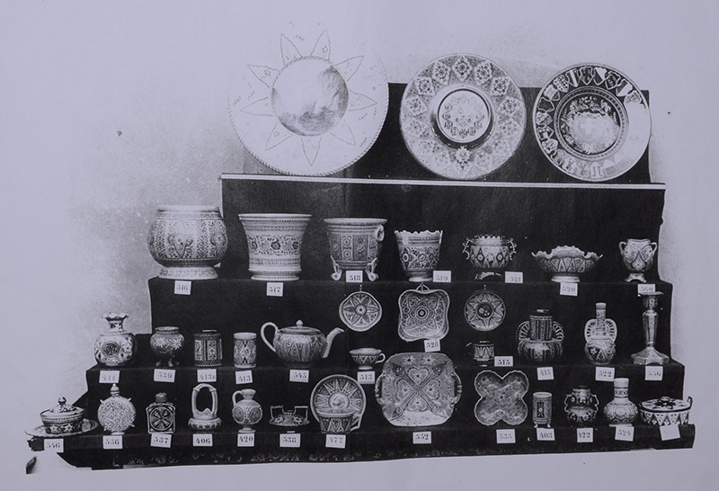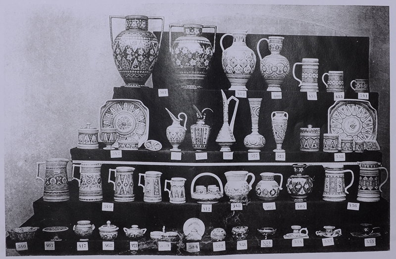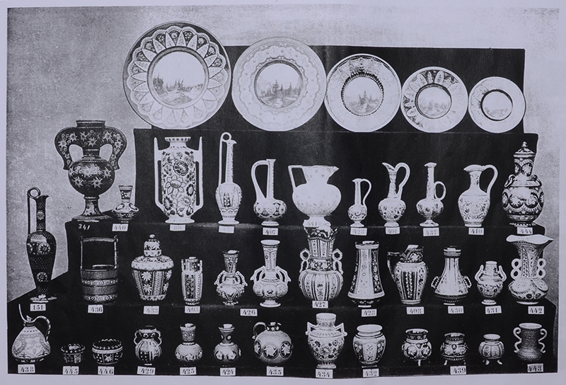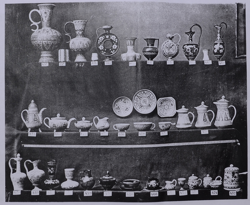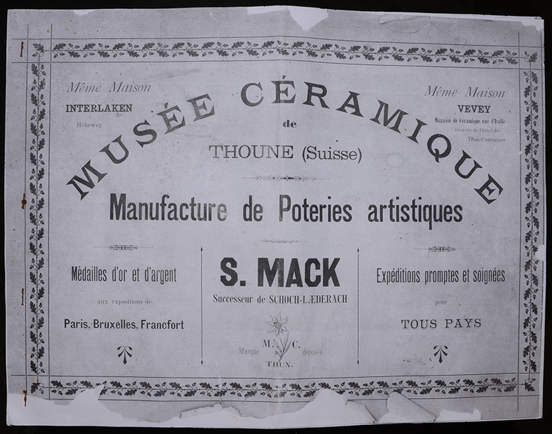Von der Keramikhandlung „Musée céramique“ in Thun hat sich ein Musterbuch aus der Zeit des zweiten Besitzers Samuel Mack erhalten. Dieser besass das Musée von 1890-1898. Das Musterbuch ist nicht datiert, jedoch gibt es auf dem Titelblatt Angaben zu gewonnenen Ausstellungsmedaillen „Paris, Bruxelles, Frankfort“. Die Angabe „Bruxelles“ bezieht sich möglicherweise auf die Weltausstellung in Brüssel 1897, wo S. Mack für seine Keramik eine Goldmedaille erhielt (Täglicher Anzeiger für Thun und das Berner Oberland, Band 21, Nummer 231, 30. September 1897). Es erstaunt, dass die Landesausstellung in Genf 1896 nicht aufgeführt ist, da Mack dort eine Silbermedaille erhielt (Täglicher Anzeiger für Thun und das Berner Oberland, Band 20, Nummer 193, 15. August 1896). Das Musterbuch dürfte also wohl nach 1897 und vor dem Verkauf des Geschäfts im Frühjahr 1898 entstanden sein. Alternativ könnten die genannten Medaillen nur die seines Vorgängers Schoch-Läderach gewesen sein. Der Katalog würde dann durch die Markeneinführung (SJAB 8, No 127, Seite 648) auf die Zeit nach dem 2. September 1890 datiert.